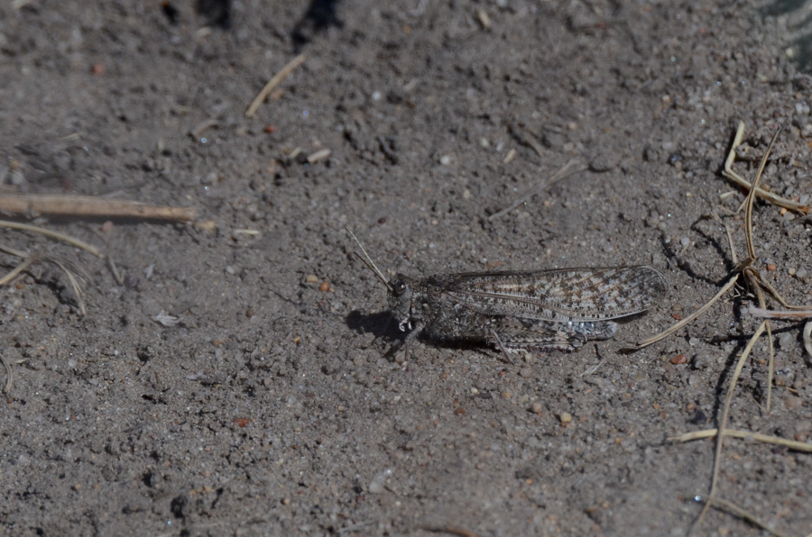 Пройдя ещё чуть-чуть в том направлении, я развернулся и пошёл обратно вдоль Кусгана в поисках подхода к открытой воде. В небо поднялись 2 Пеликана, и покружили прямо надо мной. Пролетела стайка Плавунчиков и пара Шипунов. Вдруг из-под ног вылетел какой-то, как сначала показалось, камень, прокрутился в воздухе несколько раз со звуком, похожим на позывку Таловки, и упал на дорогу. Я пригледелся и увидел обладателя этого странного поведения – то был какой-то Кузнечик, или Кобылка – не разбираюсь. На всякий случай заснял.
