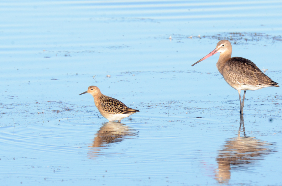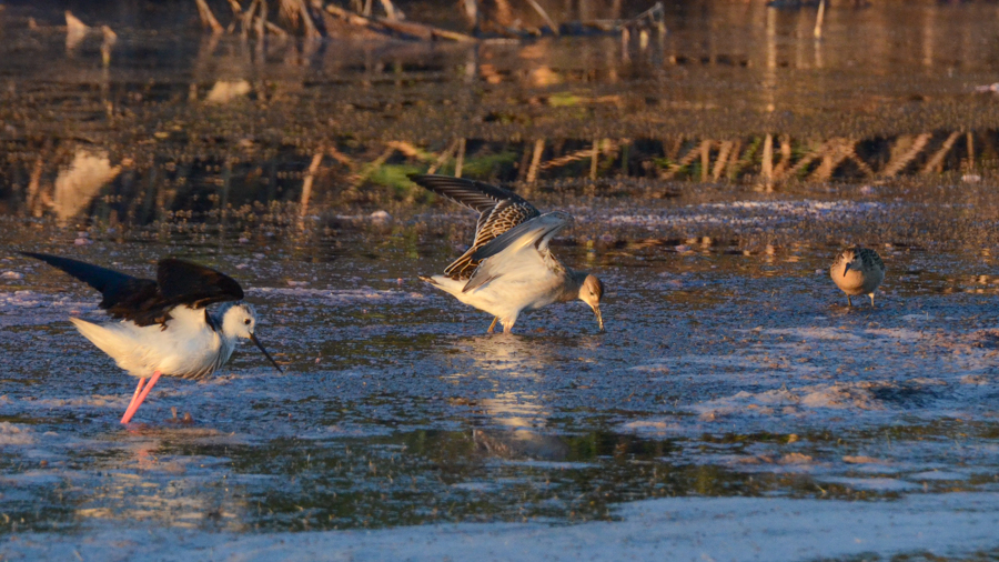 На этом водоёме кормились Фифи, Турухтаны, Шилоклювки, Мородунки, Перевозчики, Белохвостые песочники, Кулики-воробьи, Ходулочники и Большие веретенники, среди которых удалось разглядеть альбиноса. Заснять его хорошо, увы, не вышло.