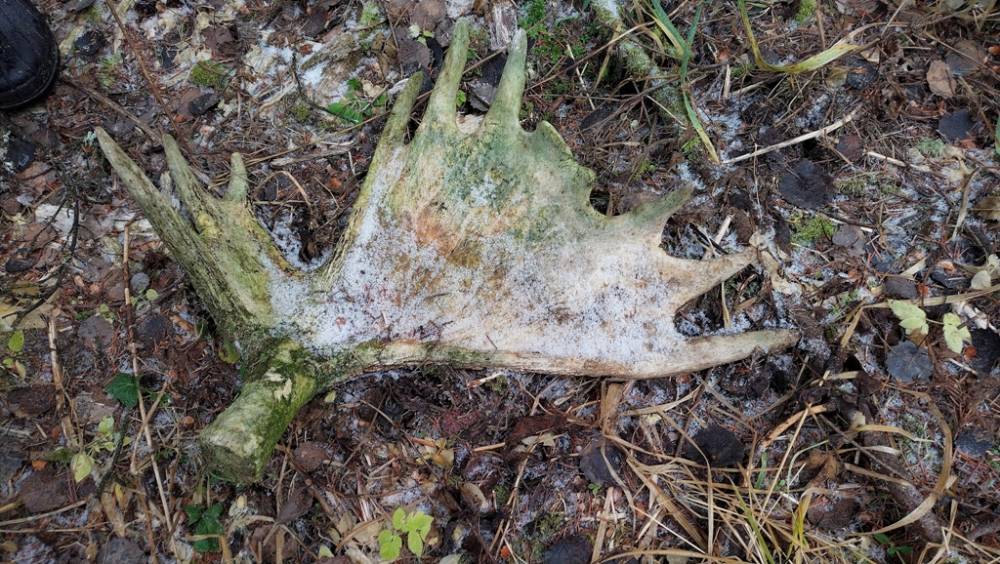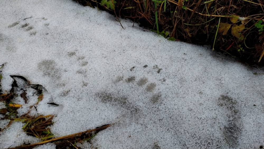 Далее тропинка подошла к старице Берди, также активно используемой бобрами, рядом с которой было несколько скальных выступов среди берёзово-соснового леса, разделённых неглубокими и пологими распадками, по одному из которых мы поднялись к основной дороге через ельник, по которой и вернулись в машину. На дороге встретили немало следов пребывания глухарей, особенно в месте, где по каким-то причинам в земле оказалась мраморная крошка, а также следы молодого медведя.