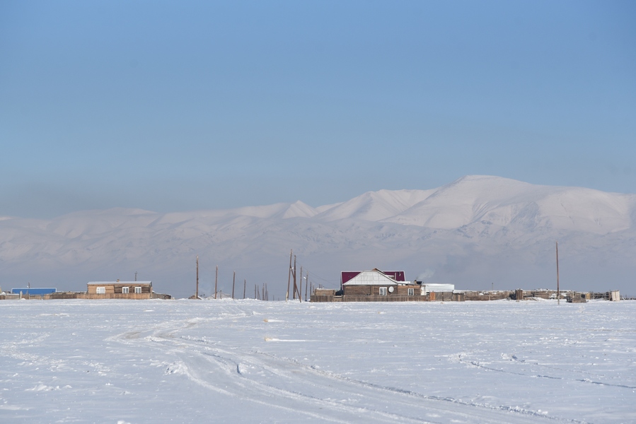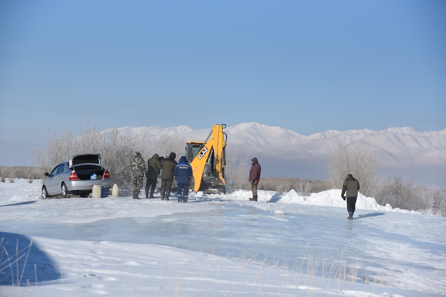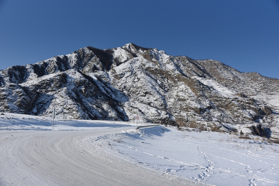 Самое бесснежное место напротив Тобелера. Просматривалась стерня. Но Джангиз Тобе (одинокую гору) увидеть не довелось. Морозы давят грунтовые воды наружу. Пар поднимается вверх. Именно здесь образовались наплывы огромной массы воды под ледяной коркой. От Тобелера по трассе метров 250 земляной вал, целыми днями рабочие ломами пробивают отводы для воды, чтобы не затопило трассу. Первое желание было немедленно вернуться в благополучный Чемал.