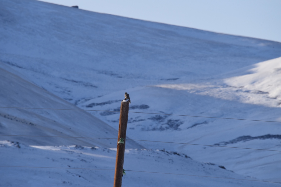 Единственная птица в Курайской Котловине. В Курае было холоднее, чем в Кош-Агаче градусов на 5-7. Снега МНОГО и ветер ВСЕГДА.