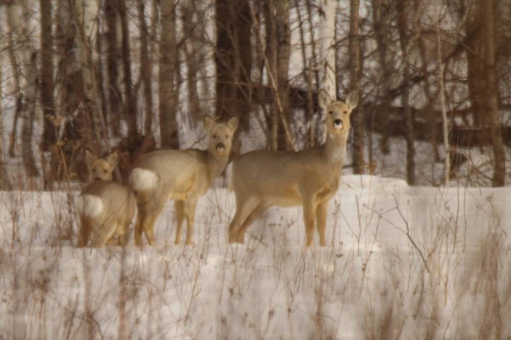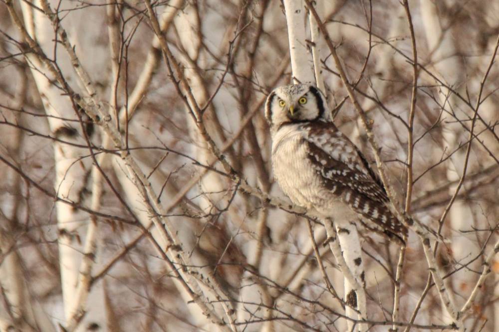 Далее до с. Чикман птиц вообще не было, да и после отмечалось совсем немного, но радует, что одной из них оказался самец бородатой неясыти, а у к пос. Лебяжинский встретилась ястребиная сова – мой первый и единственный фотолайфер в эту поездку. Также на этой дороге подняли с дневной лёжки две группы сибирских косуль. После Чулыма выехали на Омскую трассу, вдоль которой их интересного отметились лишь небольшие стайки пуночек.