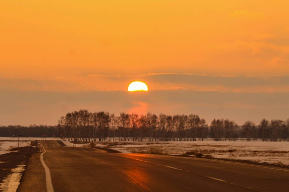 По мере продвижения в сторону с. Родино небо расчищалось, снега становилось всё меньше, и если в обед мы наблюдали мощную метель, то вечер нас встретил пыльными дорогами, а также красивым закатом за с. Камышенка Завьяловского района. После Завьялово повернули на Баево и, далее, Камень-на-Оби.