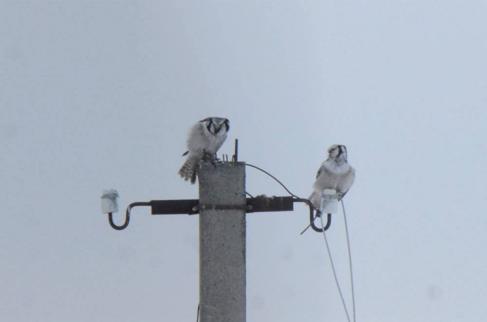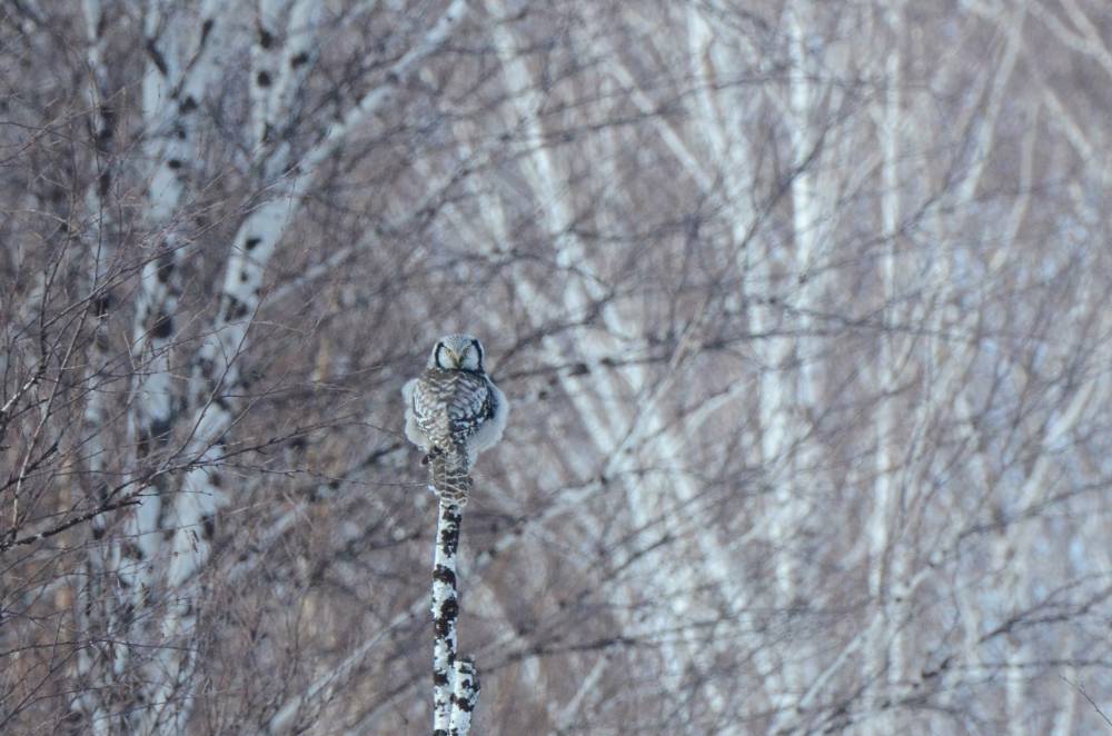 Далее довольно долго не было остановок на птиц; встречались нам лишь Чечётки, Снегири и Сойки. Лишь между сёлами Мальчиха и Марчиха я увидел на столбе вдалеке от дороги что-то, что заподозрил в интересности. Однако при рассмотрении в объектив стало понятно, что это просто самый высокий столб из всей линии; но благодаря этой остановке при осмотре остальных столбов на одном из них удалось обнаружить Ястребиную сову, слетевшую при нас дважды вниз и поймавшую как минимум одну мышь.