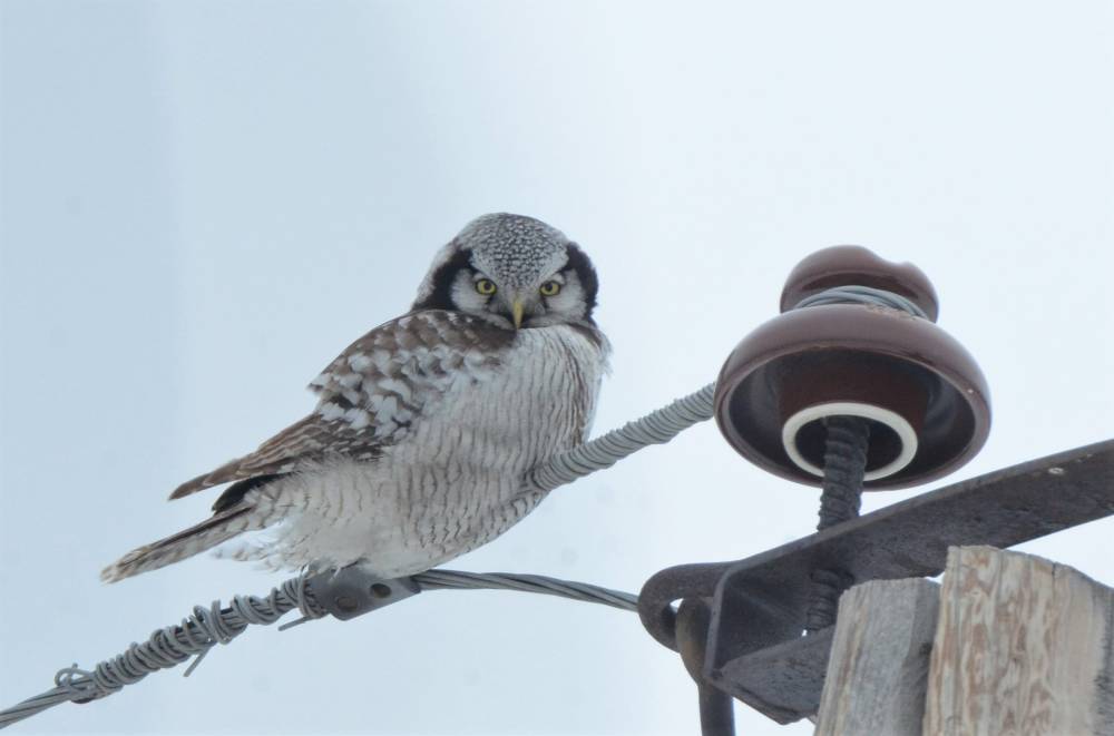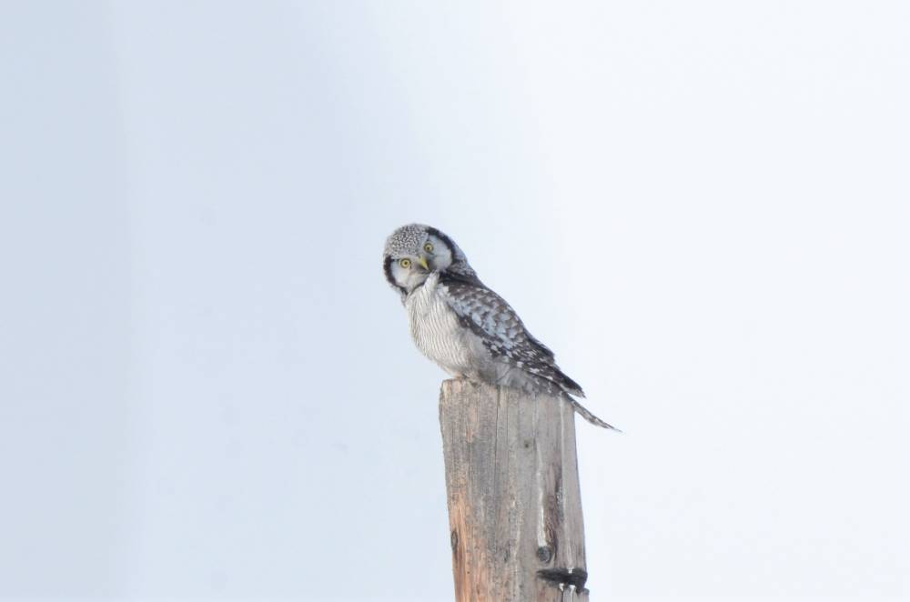 Далее выехали в сторону с. Королёвка и примерно на пол-пути до деревни встретили Ястребиную сову на столбе у дороги. Остановившись, чтобы её поснимать, встретились с Денисом Казаковым. Он рассказал, что дальше до деревни никого нет, а дорога там тупиковая, и въехать в Томскую область здесь, как мы изначально планировали, не получится.