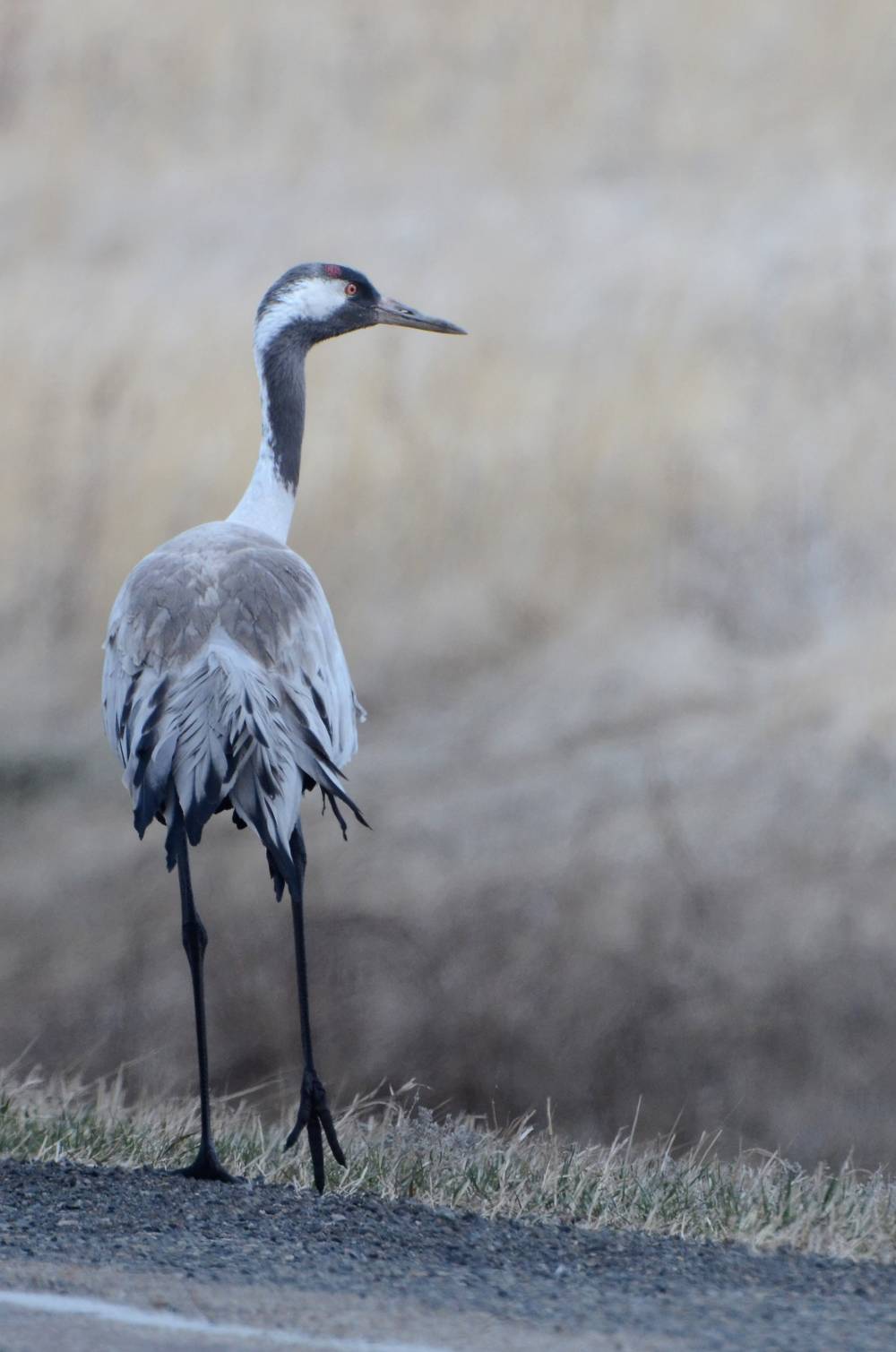 После поворота начали попадаться Серые журавли. Один из них гулял на обочине дороги, почти не обращая на нас внимания даже после того, как мы вышли из автомобиля. Проезжавший мимо мужик на грузовике заметил, что мы снимаем этого Журавля, и рассказал нам, что тот ошивается здесь уже третий год. Совсем не пугливый, хоть гуляй с ним рядом.