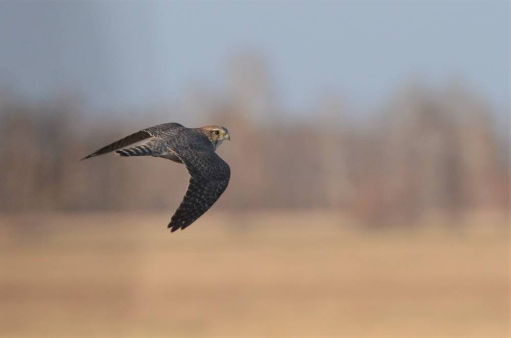После с. Орлеан встретили красавца – Дербника на кусте у дороги. От с. Златополь свернули налево к с. Семёновка – по свету хотели заехать на озеро Горькие Кильты, где коллеги встречали Белокрылого жаворонка.