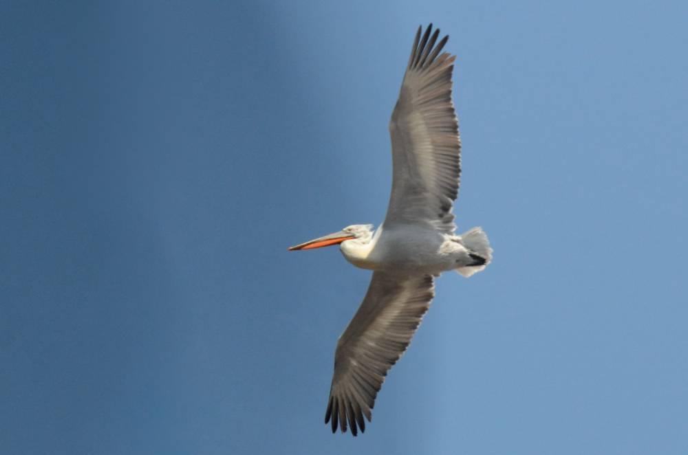 По пути никого не встретили, кроме пары Серых гусей; и лишь на подходе к озеру в поле нашего зрения показался одиночный Кудрявый пеликан. Он поднялся с озера и набирал высоту, смешавшись позже с парящими Коршунами и Болотным лунём.