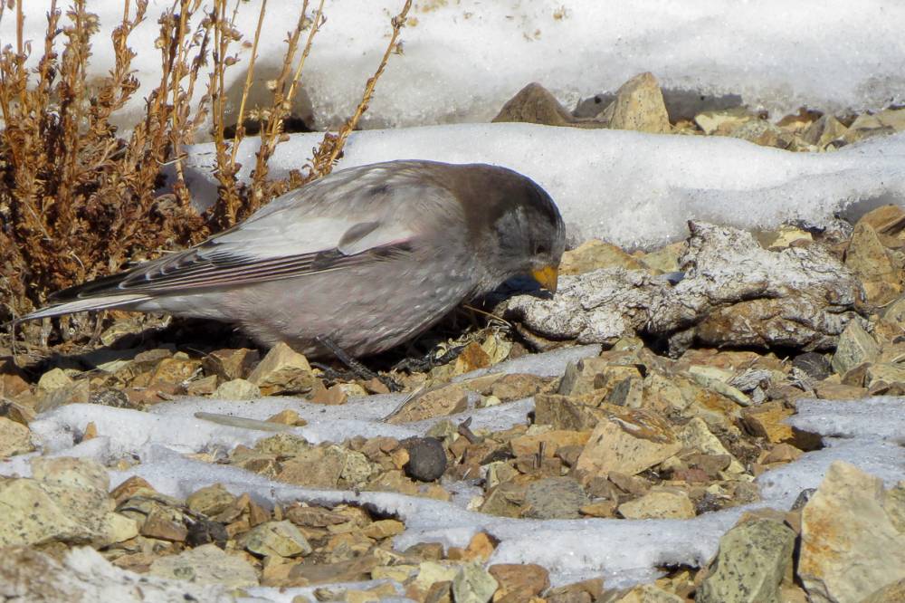 Дойдя до кошары, мы повеселели, поскольку птиц там и правда было довольно много. В числе прочего там отметились Горные чечётки, Жемчужные вьюрки, стая Скальных голубей; а по ближайшему склону перелетали Снежные воробьи и группы Клушиц. Верхом вдоль скал пролетел Балобан, всех распугав и не дав нам время его отснять.