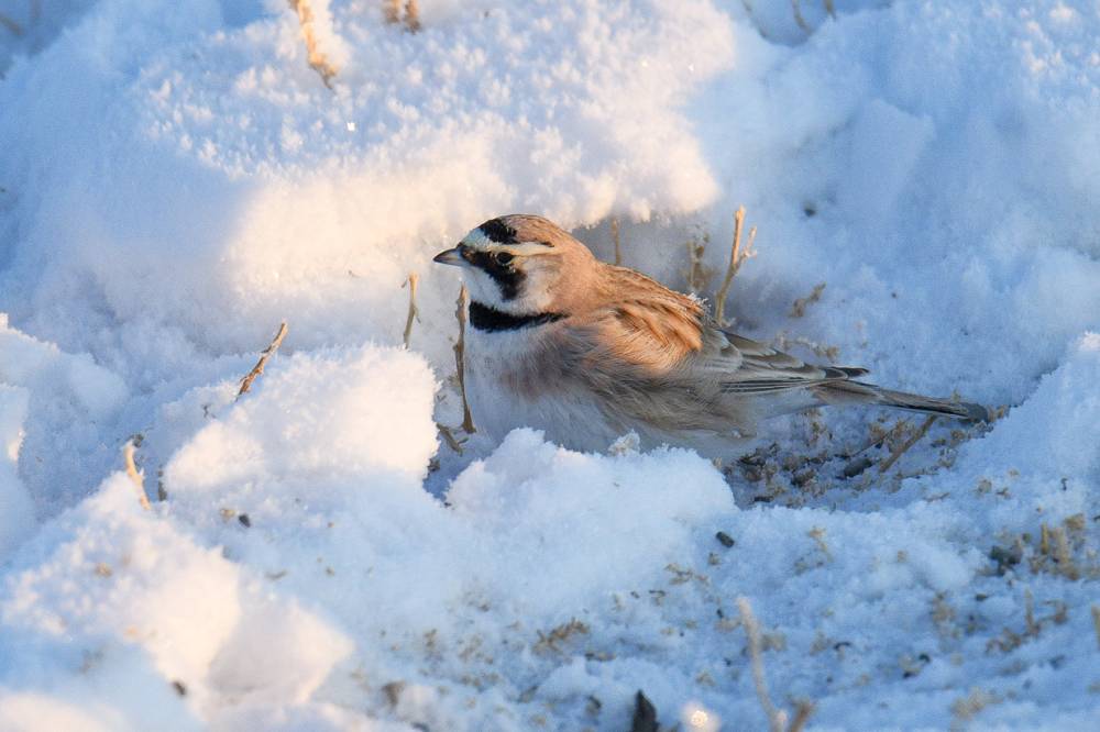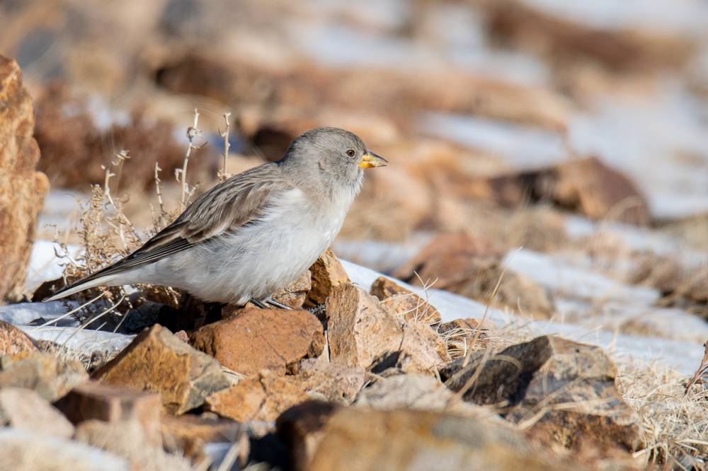 Довольные таким раскладом, мы получили неплохие кадры и двинулись дальше. Остановившись у одной из хорошо освещённых горок, решили взобраться на неё и осмотреть долину с верхней точки. Встретили у её подножия ещё одну стаю Снежных воробьёв.