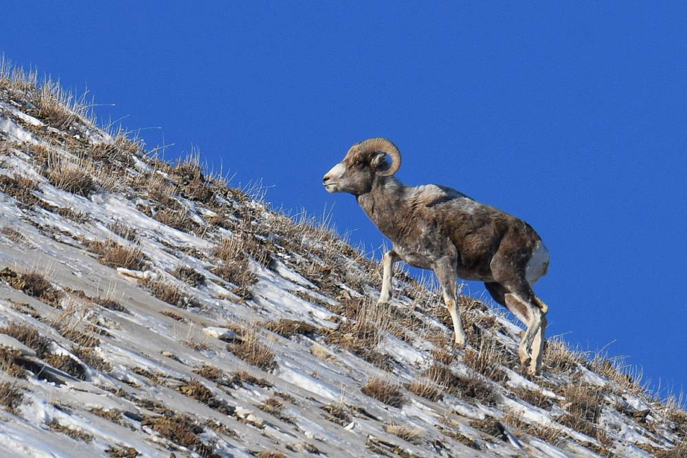Чем дальше мы отдалялись от трассы, тем меньше становилось снега как на склонах, так и у дороги. Вообще стоит сказать, что снега нынче что в Чуйской степи, что вне её оказалось не очень много (разве что Курайская степь на Запад от Курая была прилично засыпана). Вскоре на склоне справа от дороги мы встретили первое стадо Архаров, стоявших на удивление низко. Эта встреча нас порадовала, мне так и вовсе довелось наблюдать их впервые.