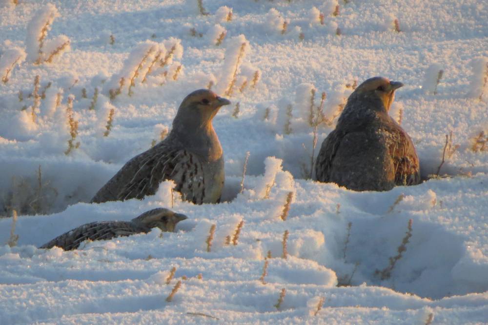 Выехали из Коша около 9 утра, рассчитывая ещё раз заехать попытать удачу за чечевицами. По пути встретили стайку Бородатых куропаток в ночлежке у трассы перед Ортолыком. Там же кормились несколько Рогатых жаворонков.