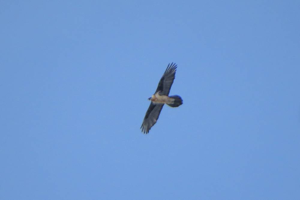 Интересно стало ехать после моста через реку Бельгебаш. Вскоре встретился кружащий у вершины горы Бородач. Мы остановились, отсняли его, но он быстро свалил за гору. Мы двинулись дальше, и через некоторое время встретили ещё одного Бородача. Там же при остановке увидели двух Чёрных грифов, летящих транзитом на Северо-Запад вдоль трассы. В общем в сумме до Акбома были встречены 4 раза Бородачи (вероятно, 3 особи), дважды Чёрные грифы (2, и затем 3 особи), и дважды Беркуты (по одной птице). Жаль, что все хищники были высоко, и хороших кадров получить не удалось.