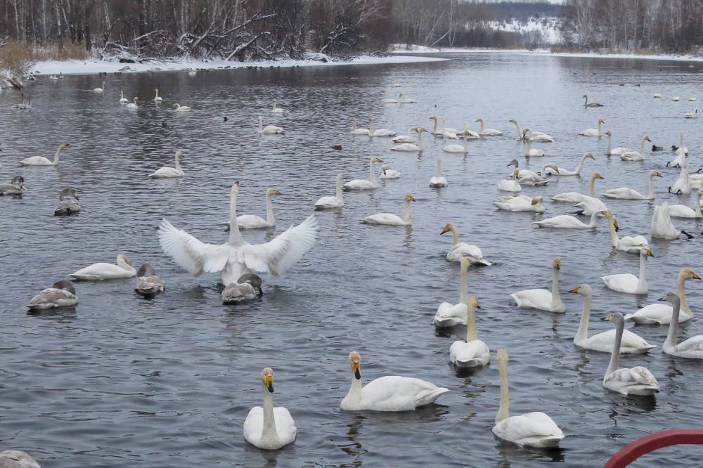 Огорчённые, поехали далее, и на речке перед с. Урожайное встретили троицу Лебедей-шипунов. Говорят, они все зимы держатся в этом месте.