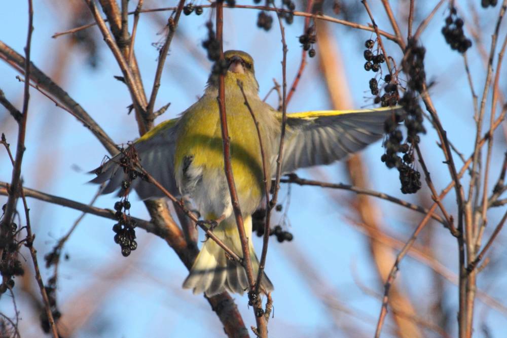 Этой зимой впервые в Новосибирской области остались на зимовку зеленушки. Если не считать встречу 7 особей зеленушек 22 февраля 2011 г. на территории станции Новосибирск-Западный А.П.Яновским (Жуков, 2012). Зеленушки находятся на территории посёлка Кольцово с 31 декабря 2015 г. Кормятся плодами черёмухи Маака. Каждый день встречается от 1 до 12 зеленушек, последняя дата их встречи - 19 января, видимо, не последняя. [...... read more ]