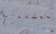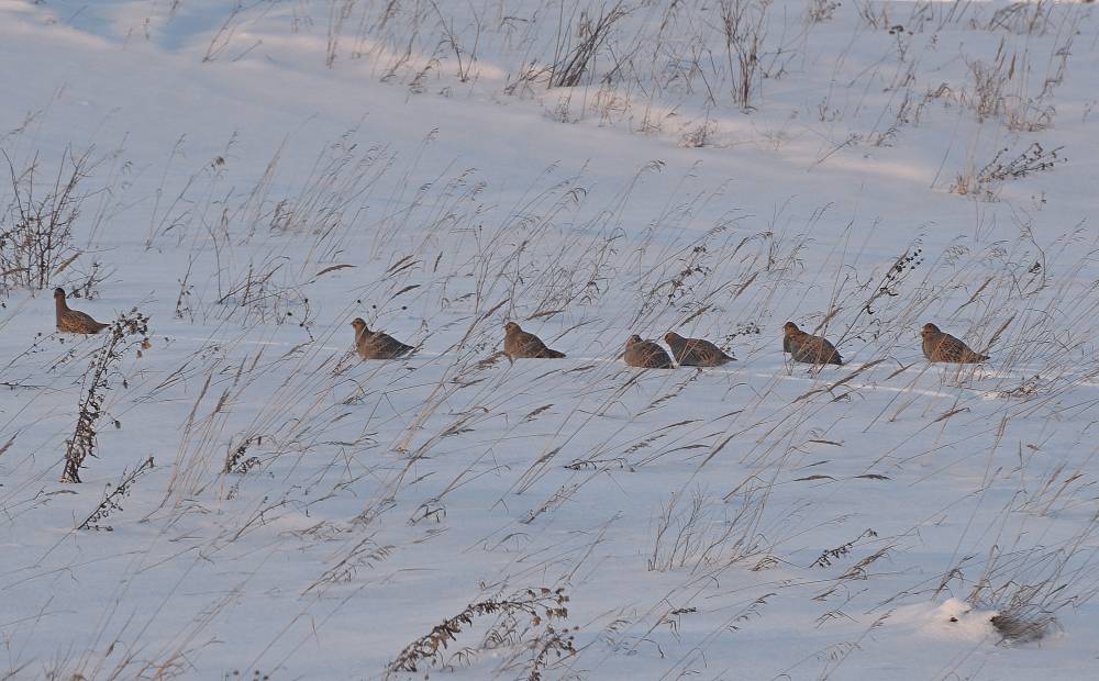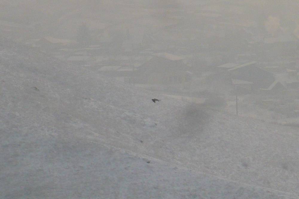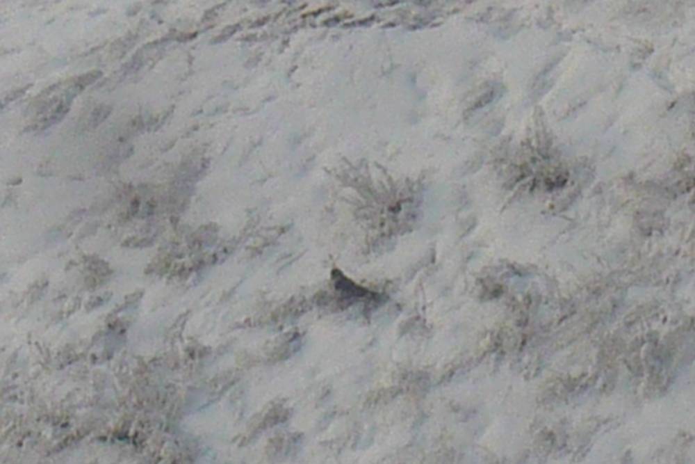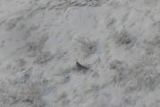 Температура -19. Я направилась на лысую гору в надежде встретить куропаток и красноухих овсянок. Куропаток я нашла у подножия горы в бурьяне среди разрушенных гаражей. Вид определить не удалось, рассмотрела только 8 рыжих хвостиков на взлёте. На вершине горы птица примерно с ворону вылетела из-за полыни. Плавно пролетела очень низко, чередуя взмахи со скольжением. Тёмная ближе к чёрному сверху и беловатая снизу. 5 минут сидела на склоне, дразня ворон, взлетела при моём приближении. К сожалению не удалось ни рассмотреть ни фото получше сделать. [...... read more ]