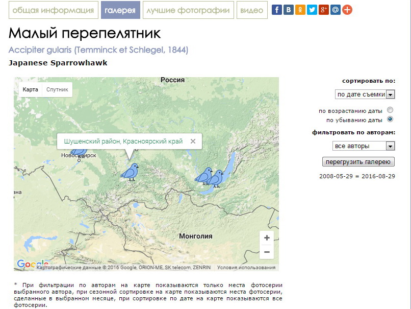 Dear friends. Please check the new service of the site. Now you can go the pages of Photoseries directly from the map on the page of the Gallery of the species (subspecies). You need only click to marker, then click to the link in the opened window with the name of place of the photo shooting.For example, gallery of the Japanese Sparrowhawk.Attention! The icon of the marker (blue bird) was taken from the Internet. If there are willing to offer its own design, please send png-file (size approximately 40x40px, mask) to email info@birds.kz. Since we plan to show on the map not only positions of photoseries but also positions of the watching sites please send the marker's design in different colors, or different design. [...... read more ]