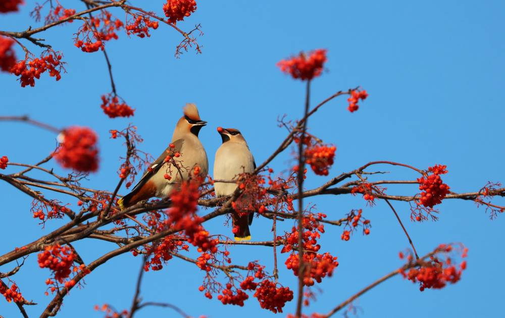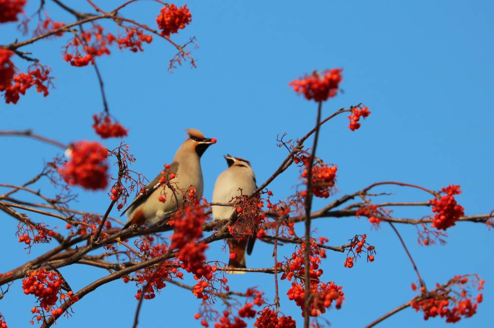 Последний день календарной осени выдался солнечным и теплым. Дачным свиристелям раздолье на рябине. Не сразу обратила внимание на эту парочку. Самец очень старался-обрывал ягоды и приносил их своей подруге; та благосклонно принимала подношение.Птицы старались держаться рядышком, и наблюдать за ними было большим удовольствием. Поискала у Рябицева, но не нашла, в интернете же противоречивая информация о постоянстве пар у свиристелей. А еще не думала, что они настолько заранее готовятся к весеннему созданию прочной пары! [...... read more ]