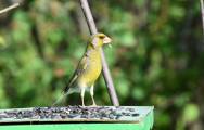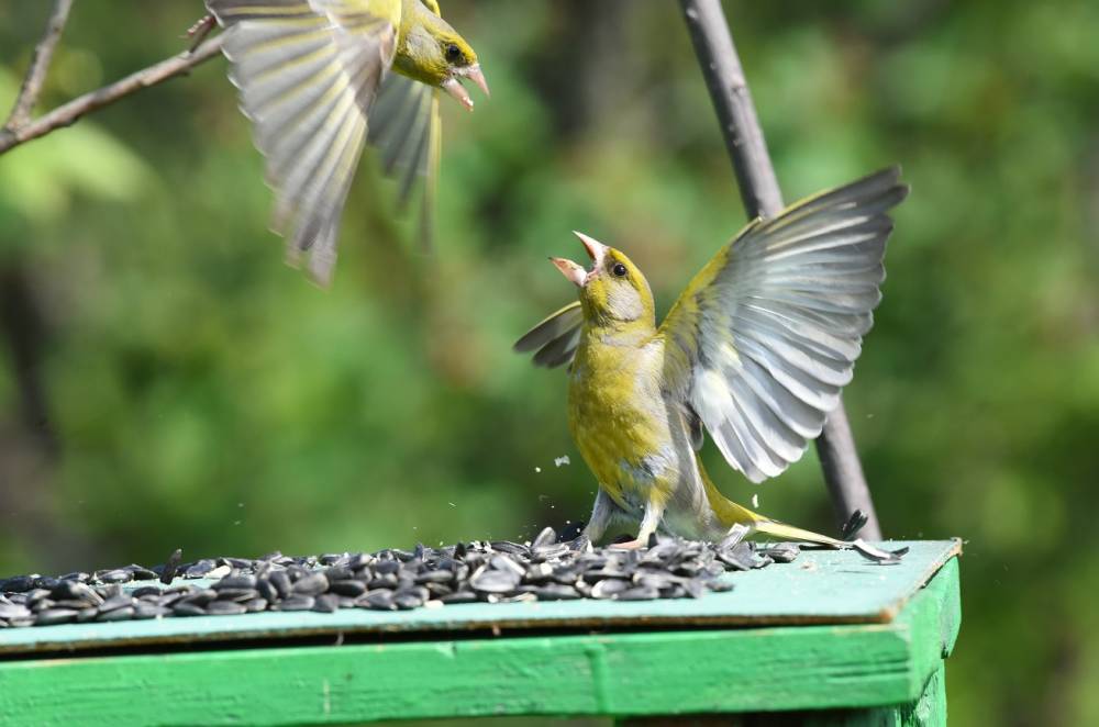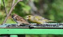 На даче у нас гнездятся синицы в моих дуплянках, развешаных в округе, поэтому я временами кидаю семечек на кормушки, чтобы птахи не отвыкали. Но в нынешнем году неожиданно появились зеленушки, которых в нашем районе до прошлого года как-то не наблюдалось. Зеленушки стайные птички. К тому же они оказались скандальные и шумливые. и это привлекло других птиц: прилетели воробьи, а затем и дубоносы. Дубонос на кормушке выглядел князем: нарядный, невозмутимый и великодушный, он не задирал мелких птиц, но соперника прогнал. Считается, что у зеленушек [...... read more ]