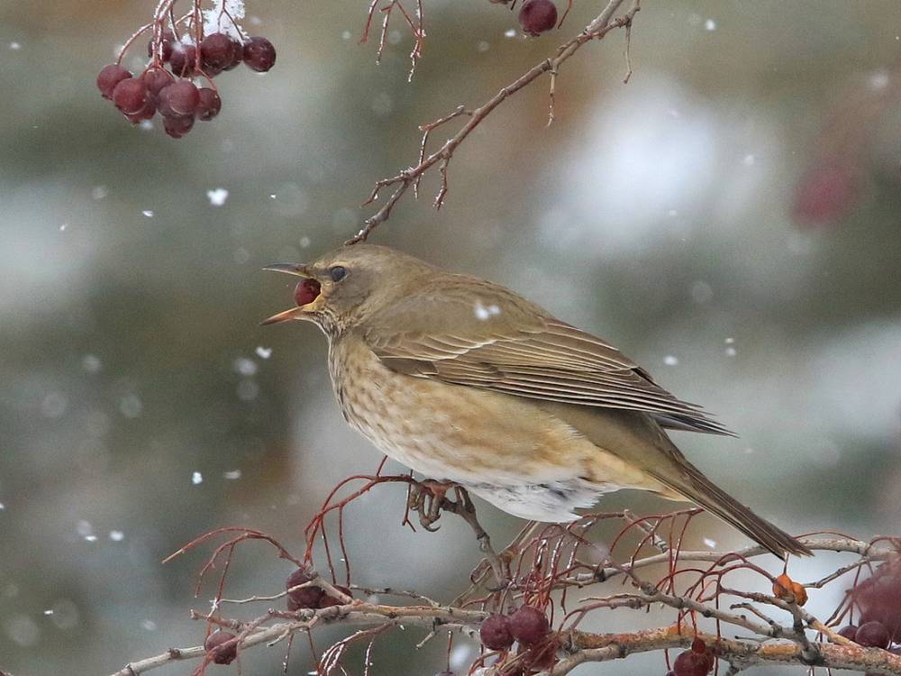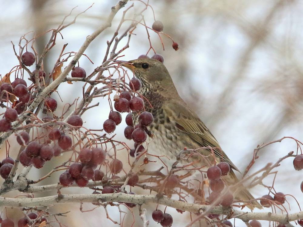 К нам на юг и юго-восток Казахстана прилетают на зимовку дрозды из Сибири. Самым массовым видом является чернозобый дрозд, а на востоке Казахстана зимует много рябинника и дерябы. В стаях чернозобого дрозда иногда встречаются краснозобые, белобровики и еще более редко бурые. Попадаются в этих стаях и гибриды.Зимой 2013-14 и 2014-15 на площадь Республики в Алматы прилетала, скорее всего, одна и та же стая чернозобых дроздов, значительную часть которой составляли особи с заметной примесью краснозобого. Эта стая кормилась ягодами бархата амурского пока [...... read more ]